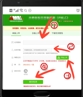 在查重頁(yè)面中首先輸入論文的題目,其次輸入論文的作者,之后將wps論文上傳至查重系統(tǒng)中,最后點(diǎn)擊提交檢測(cè)按鈕。